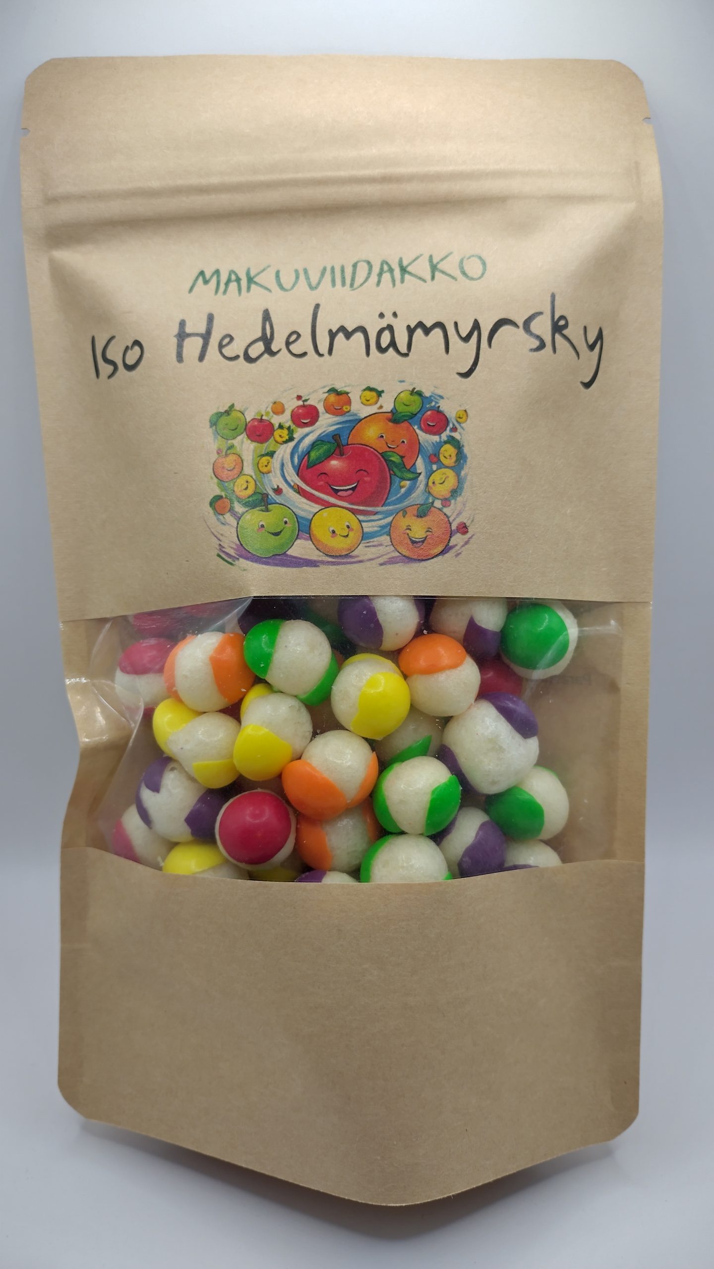 Hedelmänmakuisia pakastekuivattuja rakeita. Suuremmassa koossa.
