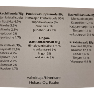 Kolme erilaista maustesuolaa lahjapaketissa: