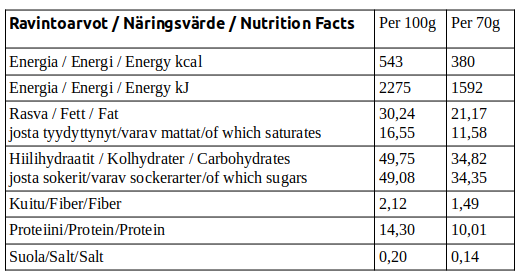Energia / Energi / Energy 543 kcal / 2275 kJ, Rasva / Fett / Fat 30,24g – josta tyydyttynyt/varav mattat/of which saturates 21,17g
