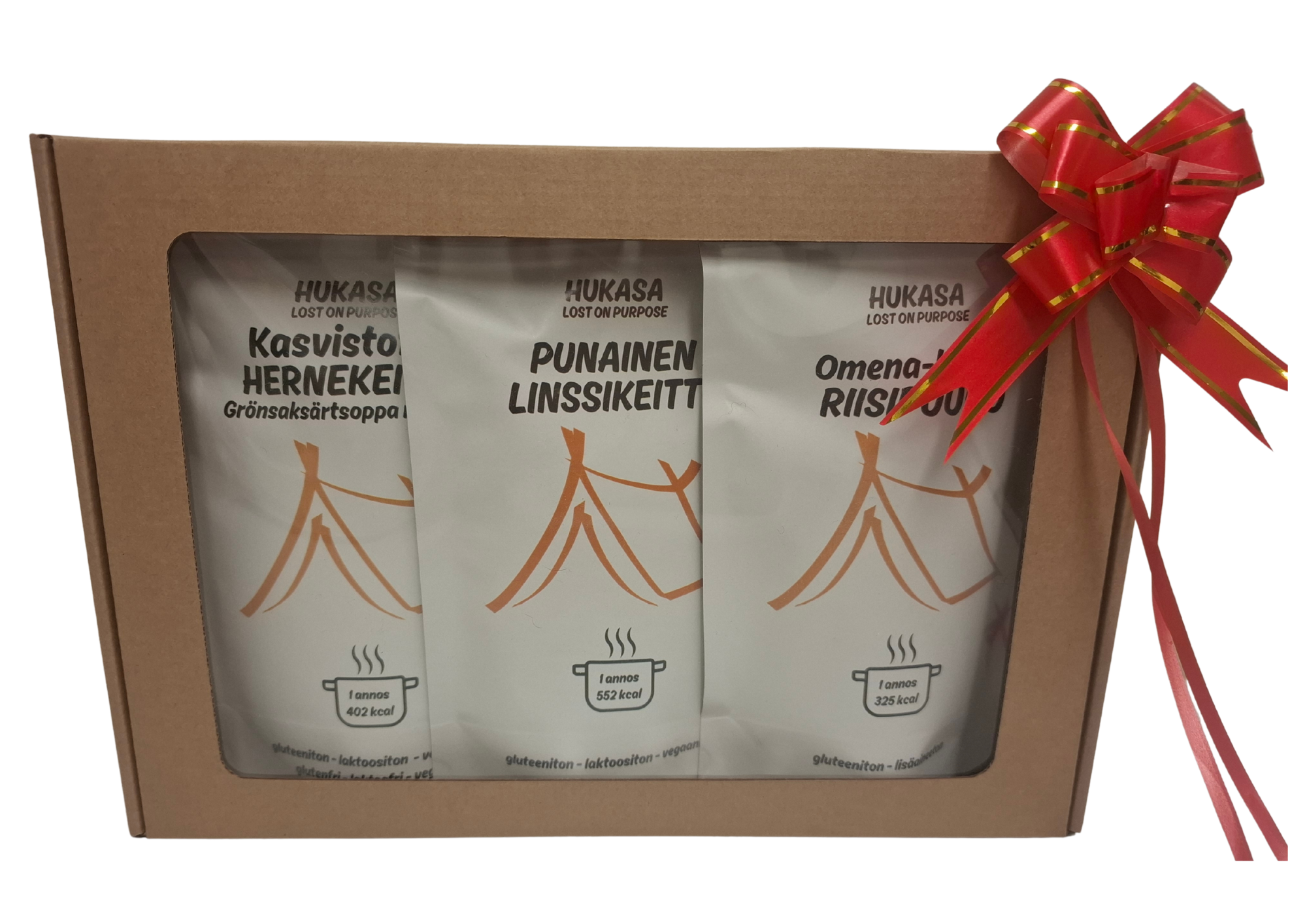 Retkeilijän paketti: Kasvistofuhernekeitto, punainen linssikeitto ja omenakaneliriisipuuro.