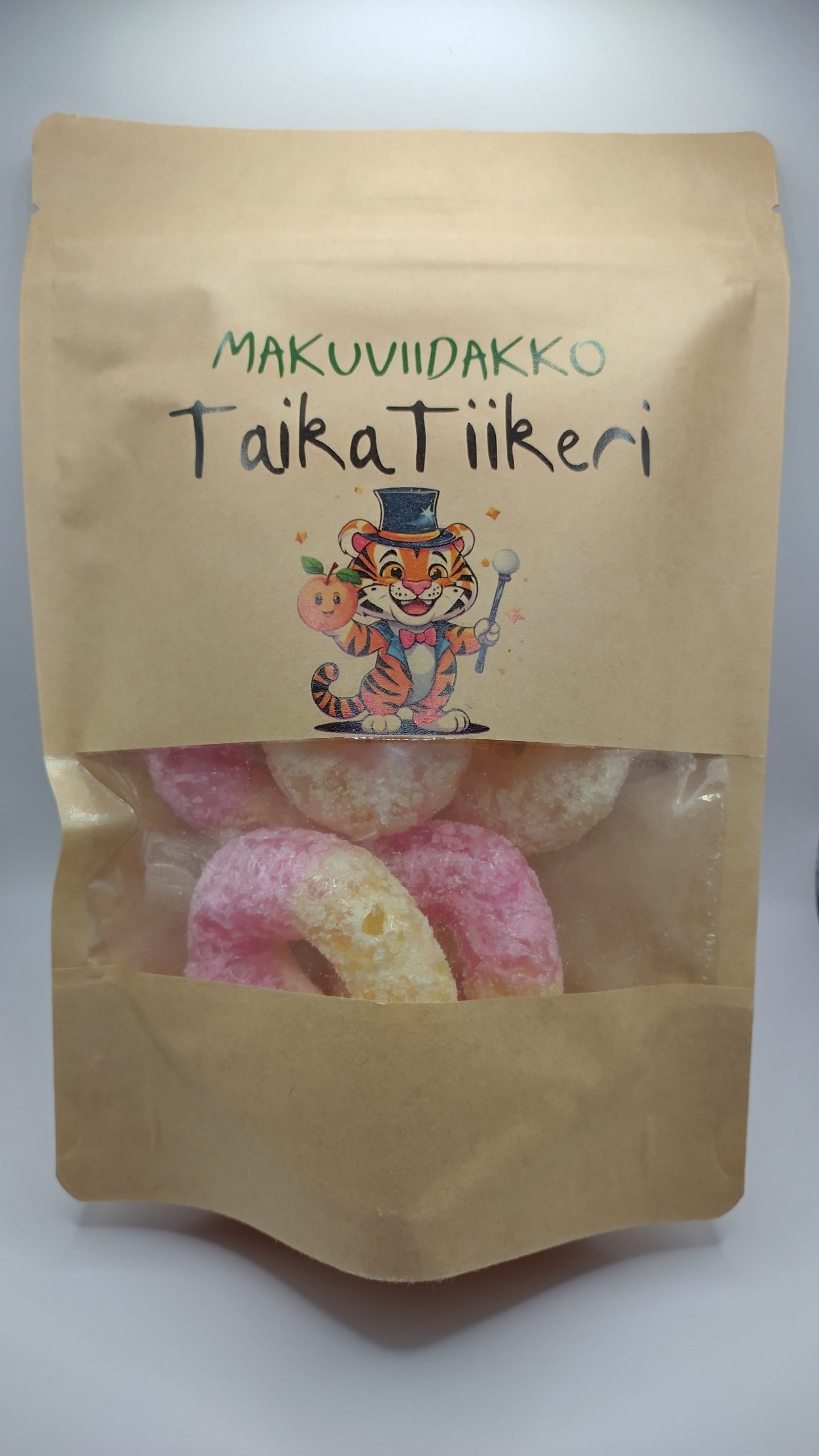 Glukoosisiirappi, sokeri, liivate, hapot (sitruunahappo, maitohappo), kosteuttaja (sorbitoli), luonnolliset aromit, värjäävät elintarvikkeet (seljanmarja, kurkuma, saflori, sitruuna), persikkamehutiiviste