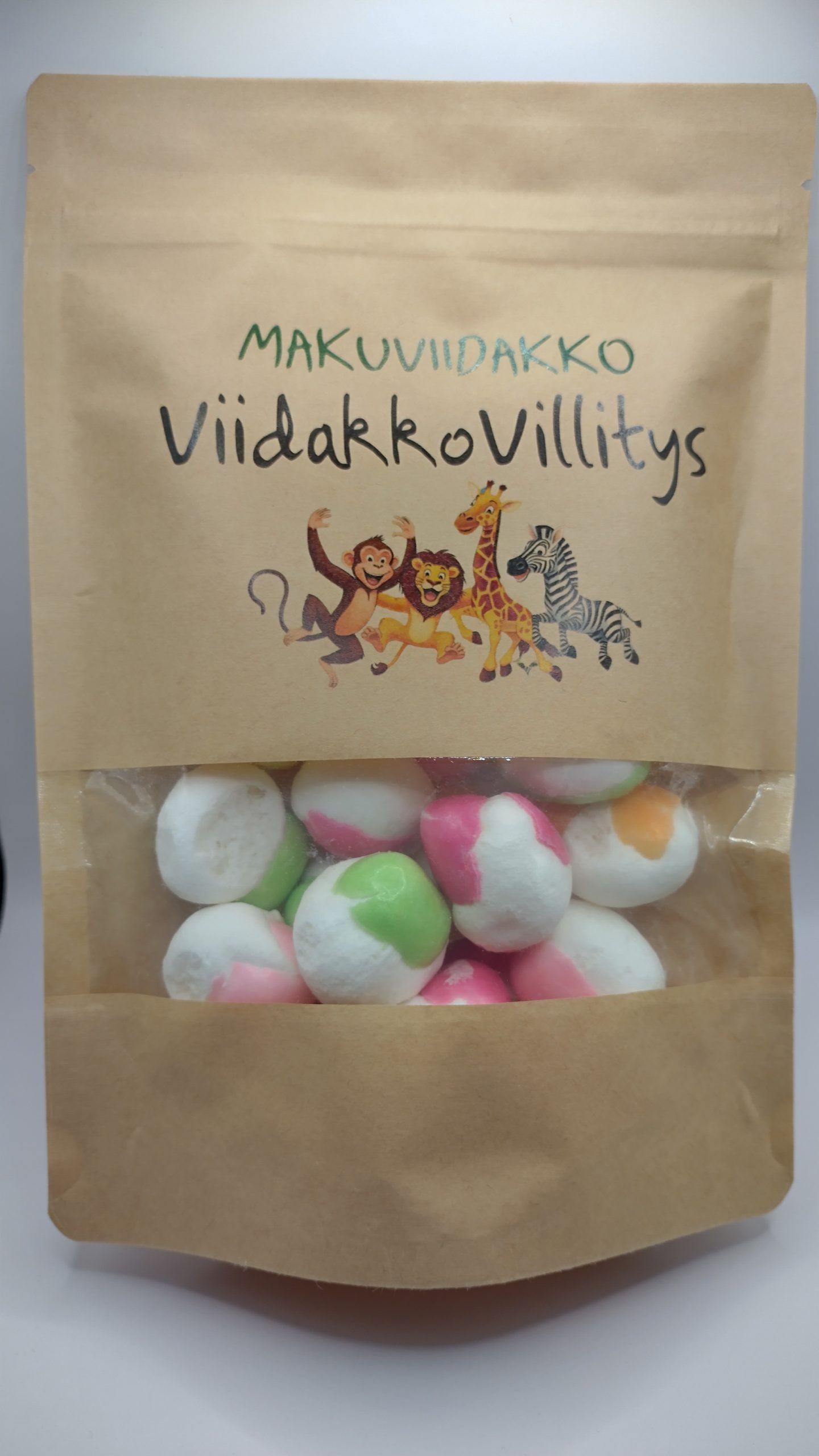 Hedelmänmakuisia pakastekuivattuja karkkeja. Muhkeita ja rapeita.
